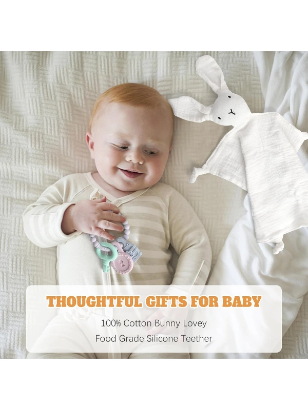 - Organic Cotton Bunny Lovey: Ultra-soft muslin comfort toy that accompanies baby anywhere.