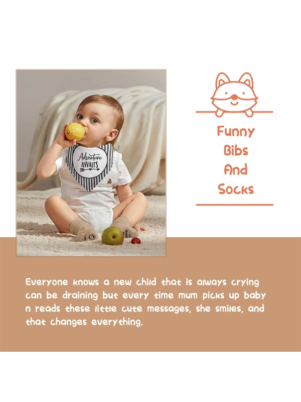 - Includes a soft baby blanket, fox lovey, wooden rattle, bibs, socks, and a “Hi Baby” greeting card.